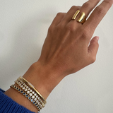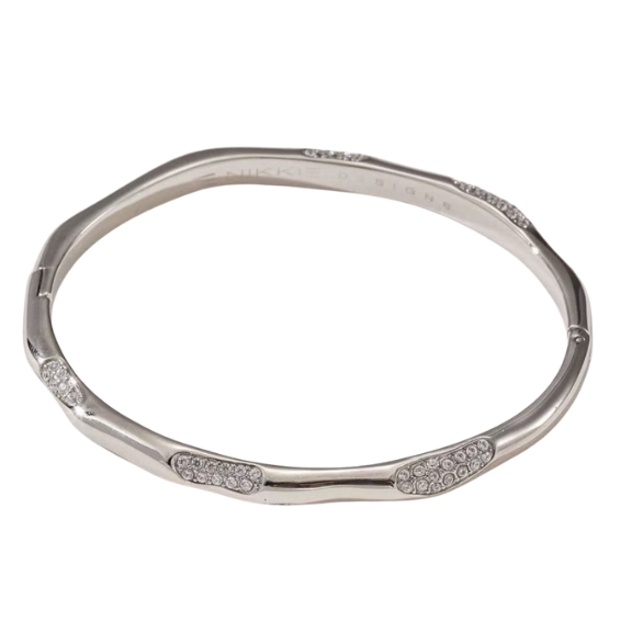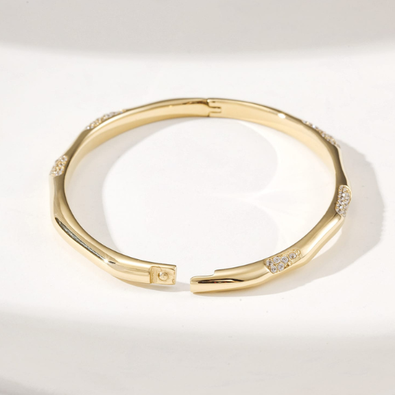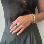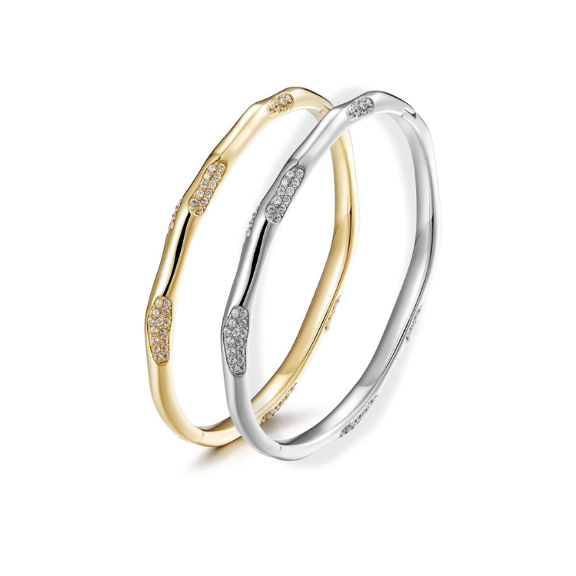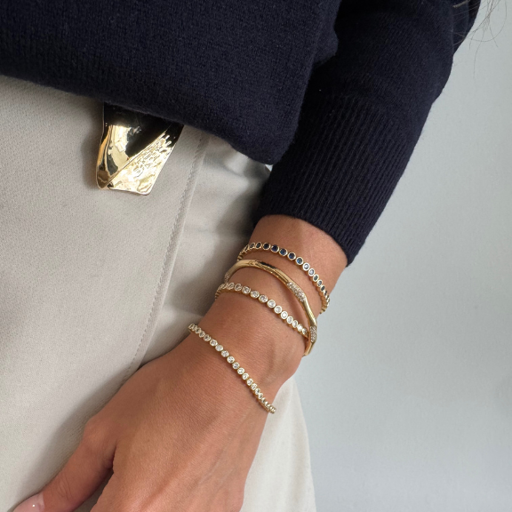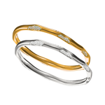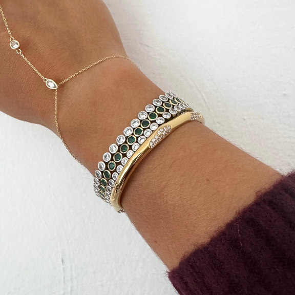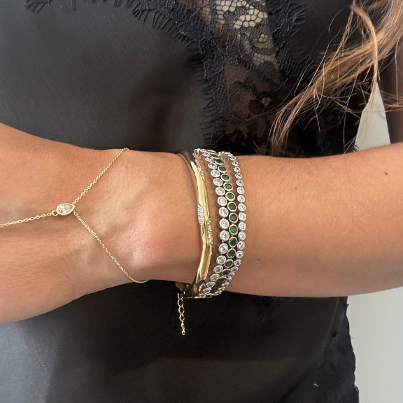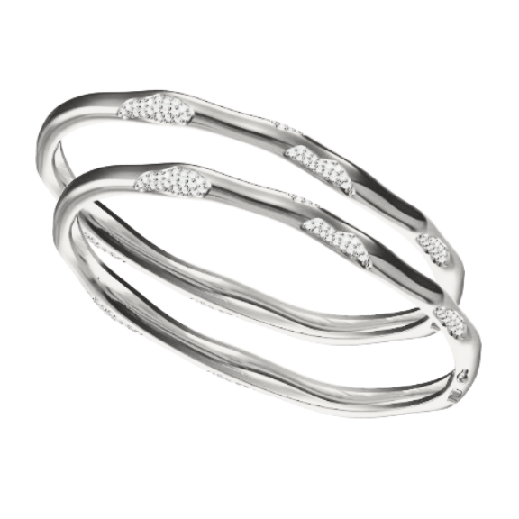 The Amara Bangle Set is a set of two thin bangles. It has a soft organic shape with encrusted cubic zirconias like our Amara Earrings. The soft organic shape gives off a soft reflection with a soft sparkle with the cubic zirconias.