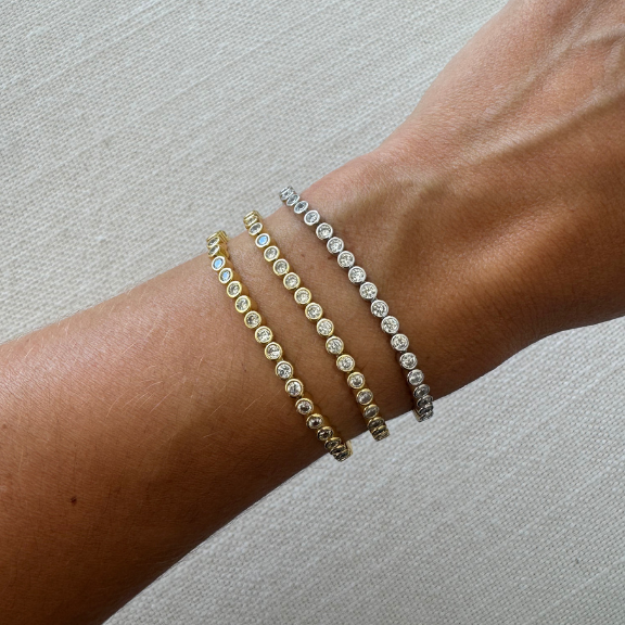 The Mini Remi Tennis Bracelet is a smaller version of our classic Remi Tennis Bracelet. Pair it with your everyday stack for an elevated laid back look or wear it on its own to show off its sparkle. The stones are cubic zirconias and are smaller for a dainty look. The closure is a concealed latch clasp for more functionality.